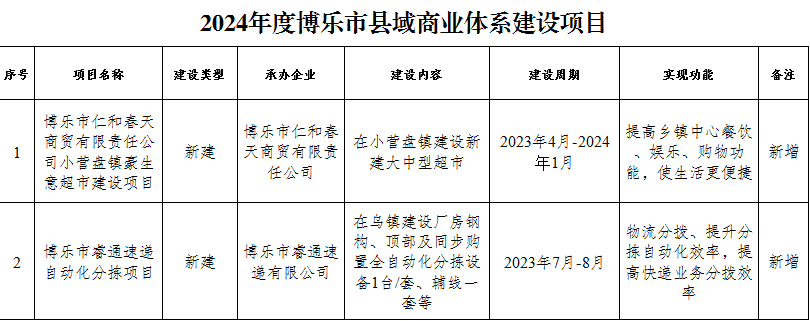 根据自治区商务厅《关于组织开展2024年支持实施县域商业体系建设行动项目工作的通知》及《自治州关于加强县域商业体系促进农村消费的实施方案》(博州政办发〔2022〕32号)有关要求,按照项目申报条件和相关程序,经乡镇推荐及企业自主申报,现将列入博乐市县域商业体系建设行动2024年度专项资金拟支持项目予以公示。