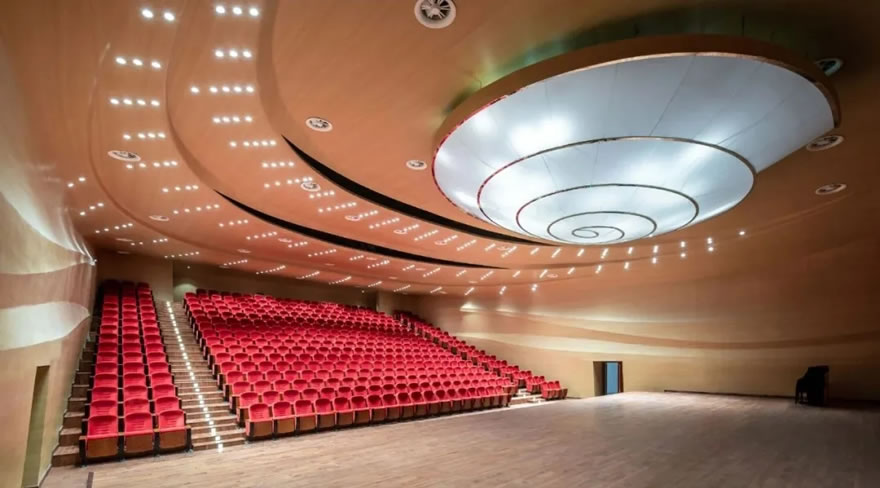 文化艺术中心通过半圆形的建筑轮廓与景观带紧紧贴合,在室内外都打造出最为开阔的看湖景观面。立面上一条柔和的曲线从建筑的一侧延伸到另外一侧,如天河般悬于建筑之上,很好地与水这一主题相呼应。