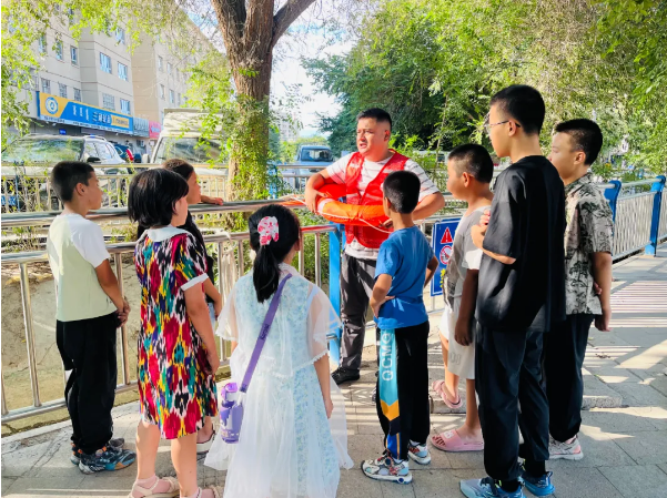 克尔根卓街道北京南路社区依托“红领巾小课堂”,联合辖区民警打造“警社联动” 安全教育模式。民警结合夏季溺水高发特点,以真实案例剖析、互动问答、情景模拟等形式,详解河流、池塘等危险水域风险,重申防溺水“六不准”,并现场示范救生圈、绳索等工具的正确使用,教授水中体力保持技巧。