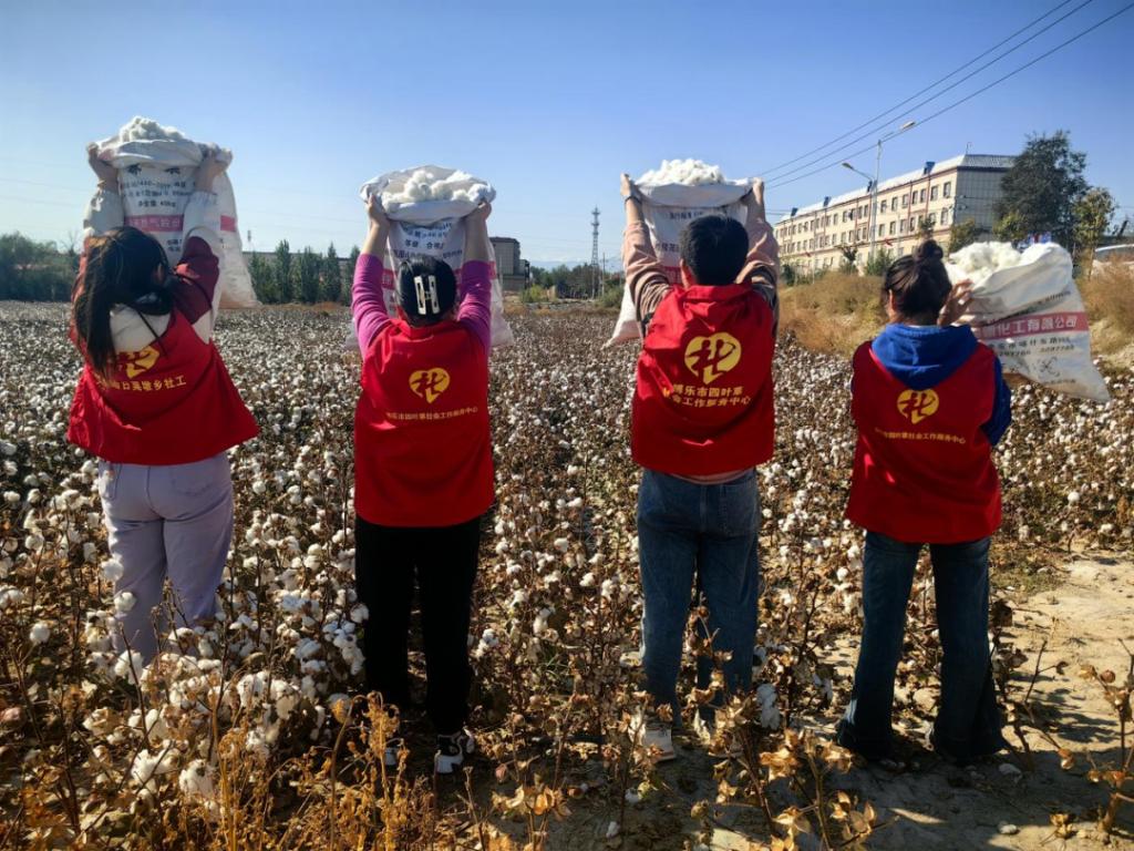 很快,四叶草社工中心整合贝林哈日莫墩乡13名社工和各村下沉党员干部,组成“助农志愿服务队”,把服务从“办公室”搬到田间地头。活动当天,大家根据棉田地块大小、棉絮分布情况分工,带着布袋子、手套来到田里。有人蹲在棉株间仔细捡拾散落的棉絮,尽量不遗漏一朵;有人把捡好的棉花集中装袋,随时跟老人确认归置位置;还有社工陪在老人身边拉家常,顺便了解他后续生活里的其他需求。