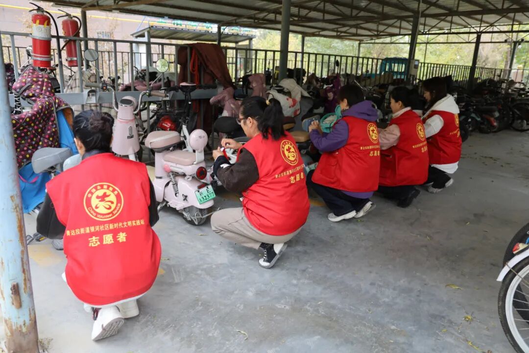 活动当天,5名身穿红马甲的社区志愿者化身“安全守护者”,带着车身反光贴、清洁毛巾、剪刀等工具,准时来到水岸丽景小区。走进小区车棚,志愿者们分工协作,将停放杂乱的电动车、自行车、三轮车逐一归位摆放,既让车棚环境整洁有序,也保障了通道畅通;随后,志愿者们投入反光贴粘贴工作,先以清洁毛巾擦拭车辆尾部灰尘油污,再按车型裁剪适配尺寸的反光贴,最后将其牢牢粘贴在车辆尾部显眼位置,确保夜间行车能有效反射光线、提升辨识度,从细节处降低夜间出行风险。