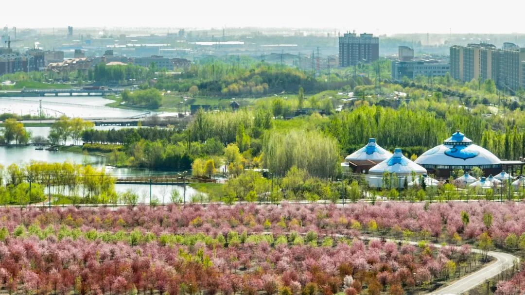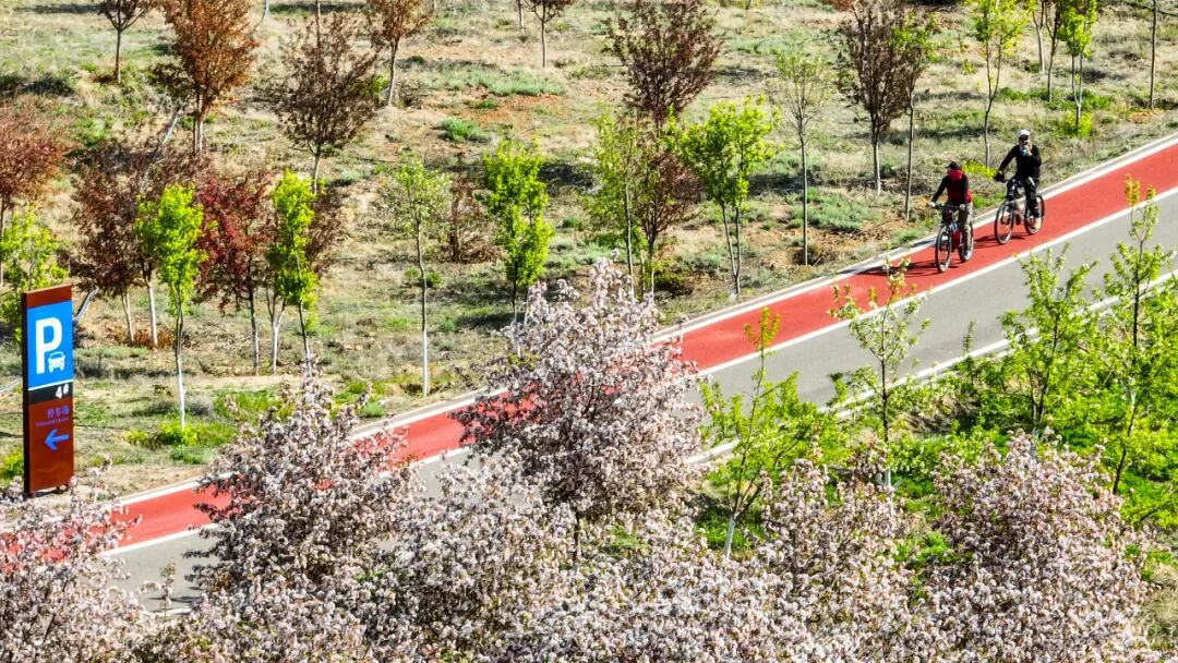 工程推进中,园区不仅建成绿化道路、供排水、供电等基础设施及旅游公厕等公共服务设施,更结合北疆气候与土壤特性,构建起以抗旱耐碱海棠为主导,苹果、沙棘、山楂等多品种共生的复合型绿化体系,目前已完成苗木种植17400亩。2019年,园区成功创建3A级景区,人行步道、共享单车等配套设施的完善,让这里成为市民休闲游憩的首选地。