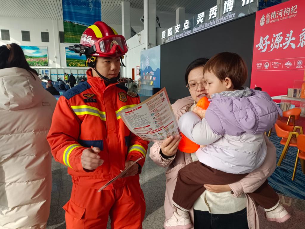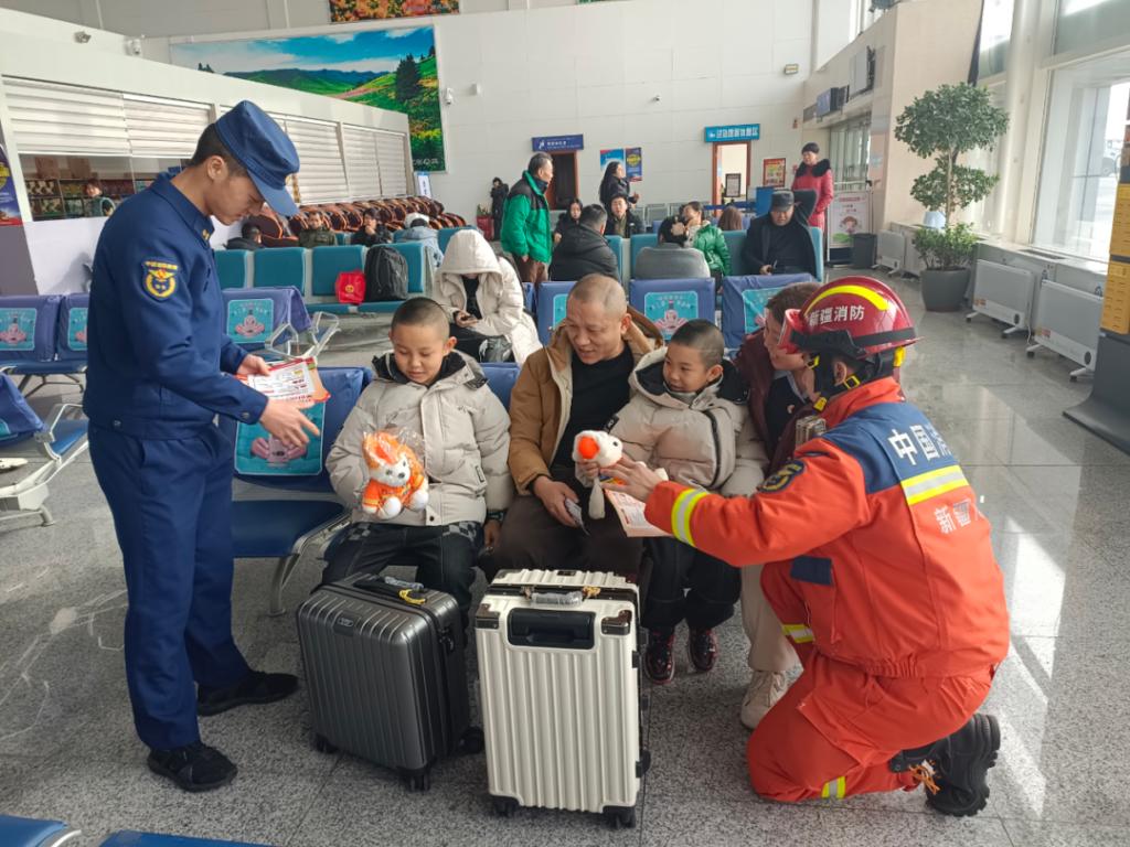 2月1日,春运期间的博乐市火车站和机场内,“消防蓝”成为一道醒目的安全风景线。博乐市消防救援大队联合相关部门,在交通枢纽开展“送春联、送祝福、送安全”宣传活动,将消防知识融入春运旅途,为旅客出行系上“安全带”。