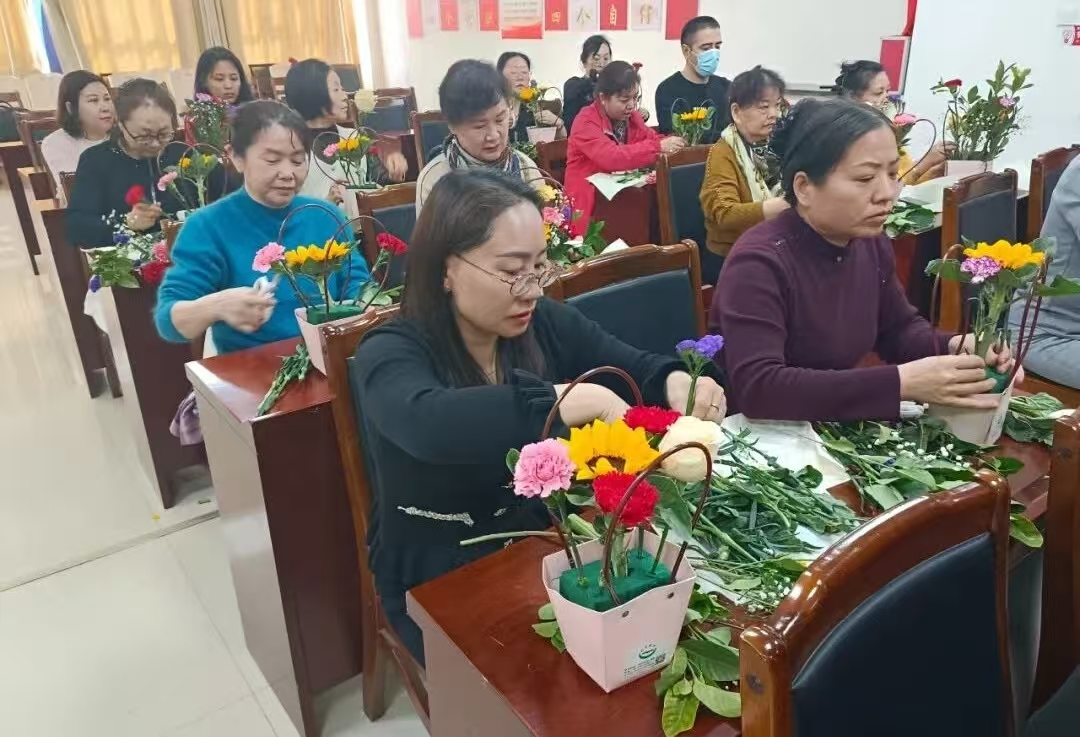 “大家修剪花枝时斜剪45度,可以增大吸水面积,这是利用了毛细现象的原理。”“插花讲究上轻下重,不仅为了美观,更遵循植物生长的自然规律。”老师一边示范,一边用通俗易懂的语言讲解背后的科学道理。母亲们听得津津有味,手随心动,将一朵朵鲜花精心搭配组合,创作出各具特色的花艺作品。