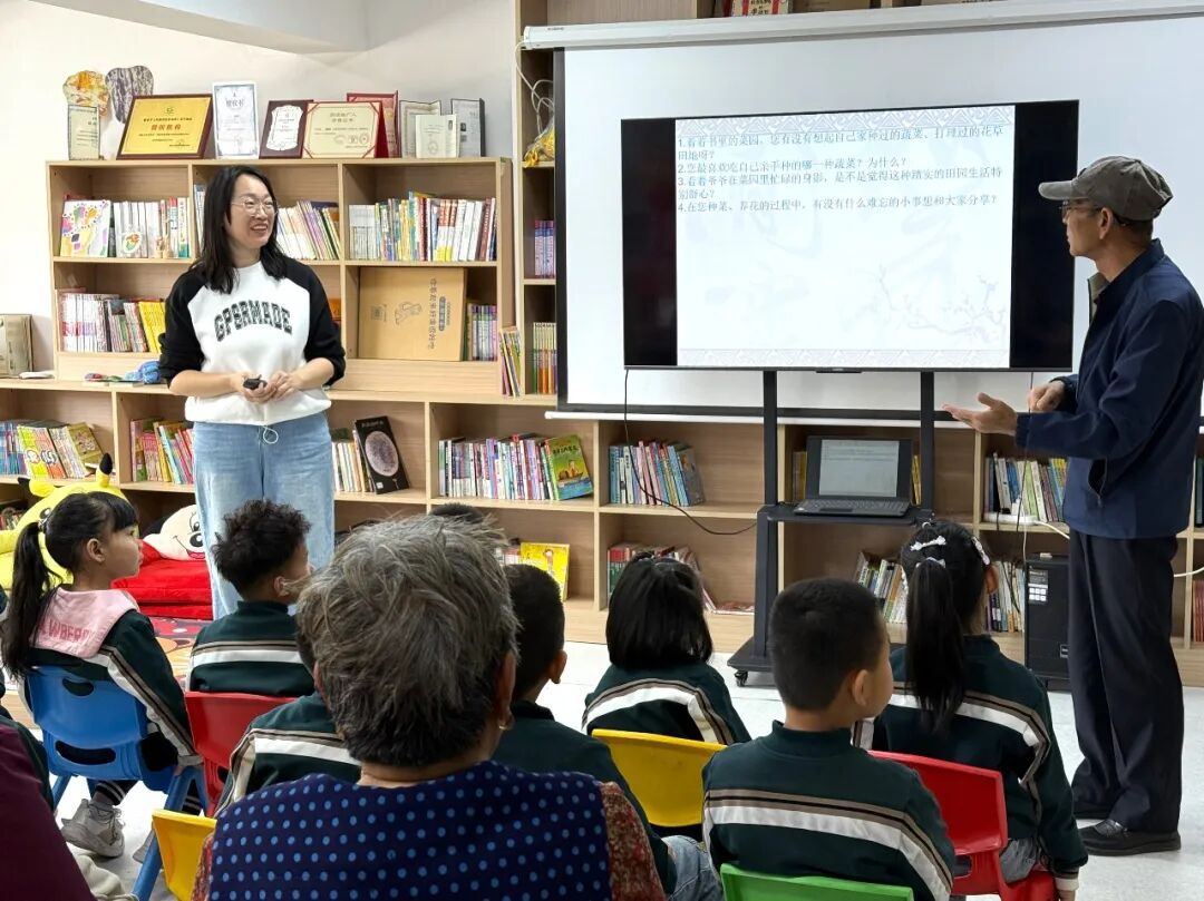 活动在温馨氛围中拉开帷幕。童书馆的老师带领大家共读绘本《爷爷的菜园》。生动的画面、质朴的文字,讲述了一方小小菜园里祖孙之间的温情故事,传递出劳动与收获的朴素哲理。孩子们目不转睛地聆听,在故事中感受亲情的温暖与土地的力量。