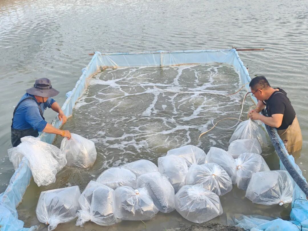 4月27日,博乐市达勒特镇套特村农祥养殖合作社内一片繁忙,300万尾青虾苗从广东冷链空运抵达,工作人员规范完成卸苗、投放,将虾苗全部放入专用淡化池。虾苗经一周水质驯化后,便可转池塘开展规模化养殖。清晨,虾苗活力十足、游动密集,技术人员蹲守池边实时观察长势、监测水质,全力做好苗期管护工作。