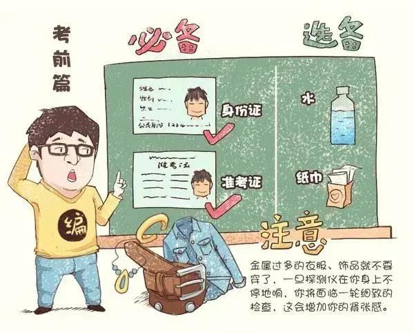 考生可携带规定的证件(身份证、准考证)、2B铅笔、0.5mm黑色签字笔、直尺、圆规、三角板、无封套橡皮、无字迹的垫板等考试用品,严禁将计算器、手机等各种通讯工具、照相、摄像、扫描、电子存储记忆录放设备、有电子显示屏幕的手表以及涂改液、修正带、透明胶带、刮纸刀等物品带入考场。尽量不要在身上装金属物品,不要穿戴带有金属的服装、鞋帽、项链、耳坠、发卡等,以免延误安检时间。