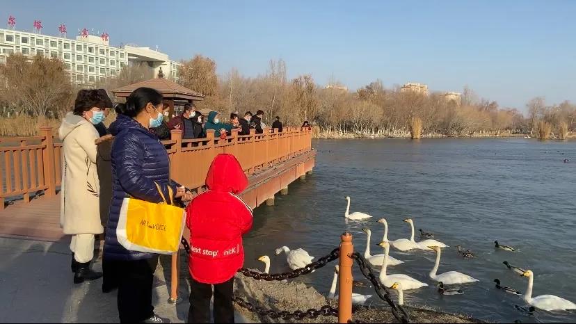 11月25日,在博乐市滨河公园成群的天鹅在河面上悠闲地游弋,它们时而展翅滑翔、轻盈踏水,时而引颈长鸣、呼朋引伴。随着滨河公园天鹅、野鸭等水鸟越来越多,不仅吸引了广大市民前来观赏,也积攒了一些摄影爱好者为粉丝,俨然一副人与自然和谐相处的画面。
