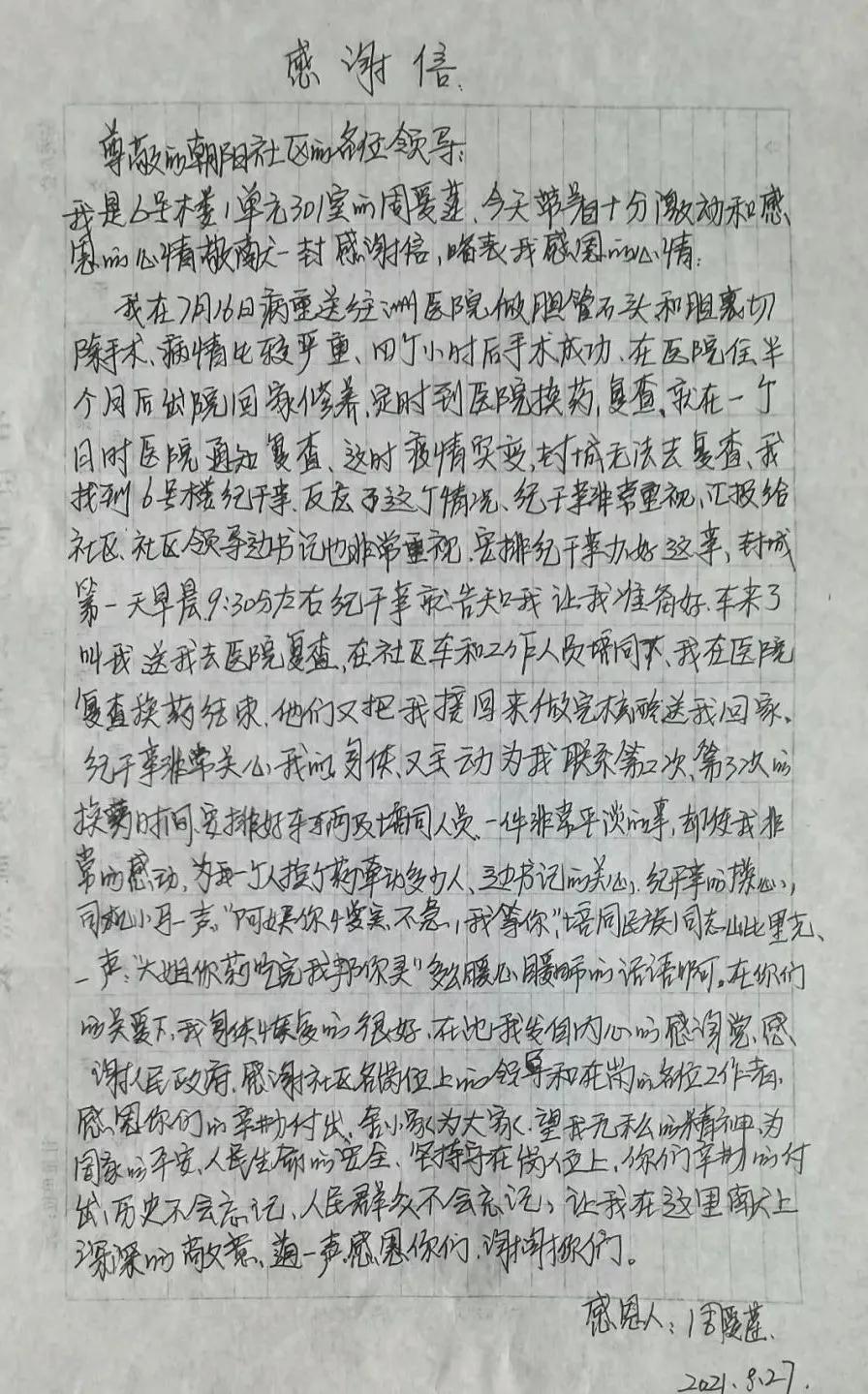 马双印有一个专门的笔记本,上面记录着每次走访入户时了解到的居民家里的困难,他会尽最大的努力逐一帮助居民解决。居民周爱莲因胆囊切除术后需要定期前往医院换药、复查,但家人都不在身边,了解到这一情况,马双印主动照顾周阿姨,每三天一次上门接送,上车前后不忘仔细叮嘱:“周阿姨,你慢点,不急,我们等你。”马双印的关心和照顾深深感动着周爱莲及周围邻居。病好后,周阿姨手写了感谢信,表达了感谢之情并给予了高度评价。