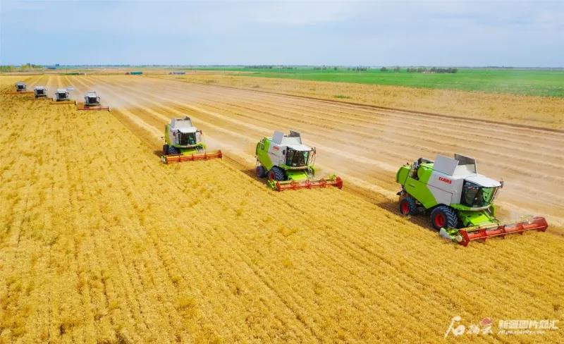 7月7日,在位于昌吉市的昌吉国家农业科技园区联强农场,7台小麦联合收割机在收割小麦。何龙 摄