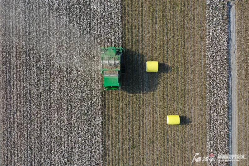 9月25日,兵团第六师芳草湖农场,打包采棉机正在采摘棉花。