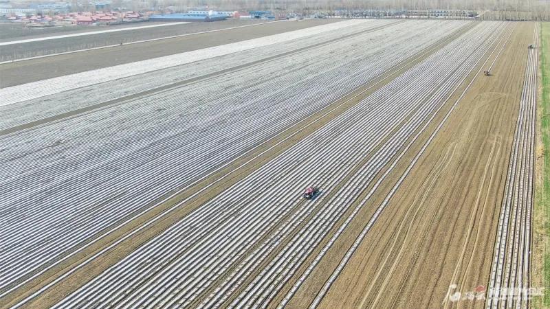 4月13日,博乐市小营盘镇当合尔特布拉格村,播种机在农田里播种土豆。博乐市种植了2000余亩土豆,均已实现全程机械化。于苏甫·艾尼 摄