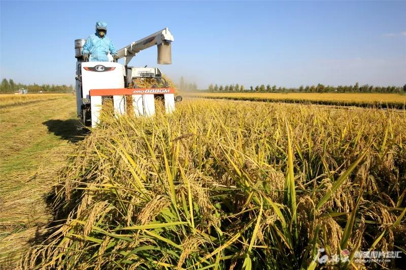 9月23日,伊犁哈萨克自治州察布查尔锡伯自治县绰霍尔镇布占村,农民在稻田收割水稻。该县种植的11.19万亩水稻成熟,农民利用收割机加紧采收,确保颗粒归仓。华岩明摄