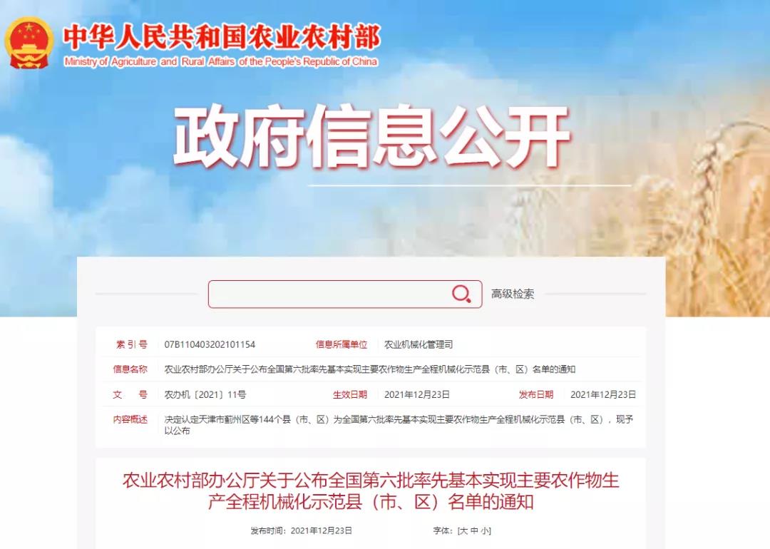 12月23日农业农村部网站发布了全国第六批率先基本实现主要农作物生产全程机械化示范县(市、区)名单