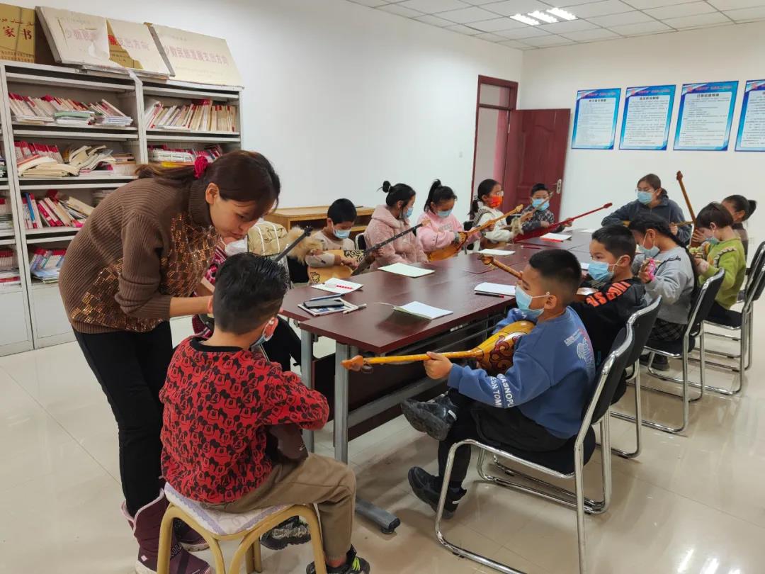 在达勒特镇夏拉楞布拉格村,新疆奎屯艺术学院返乡大学生肯巴提·叶别克在村文化室里教小朋友们弹冬不拉。