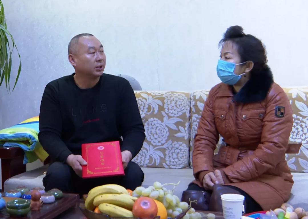 在中国红十字会“会员之星”朱红博家里,州红十字会党组书记、常务副会长黄萍与朱红博亲切交流,亲手将“会员之星”荣誉证书交到了朱红博的手上,表达对这位人民教师的敬意和慰问。