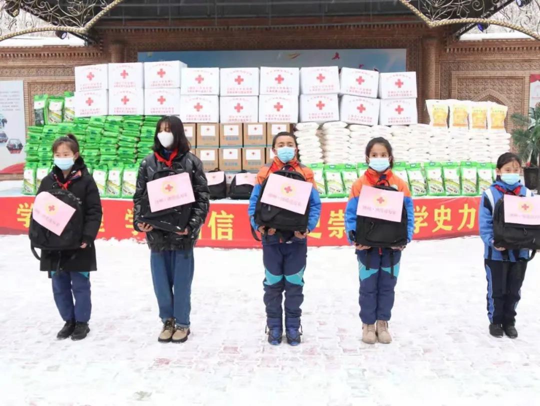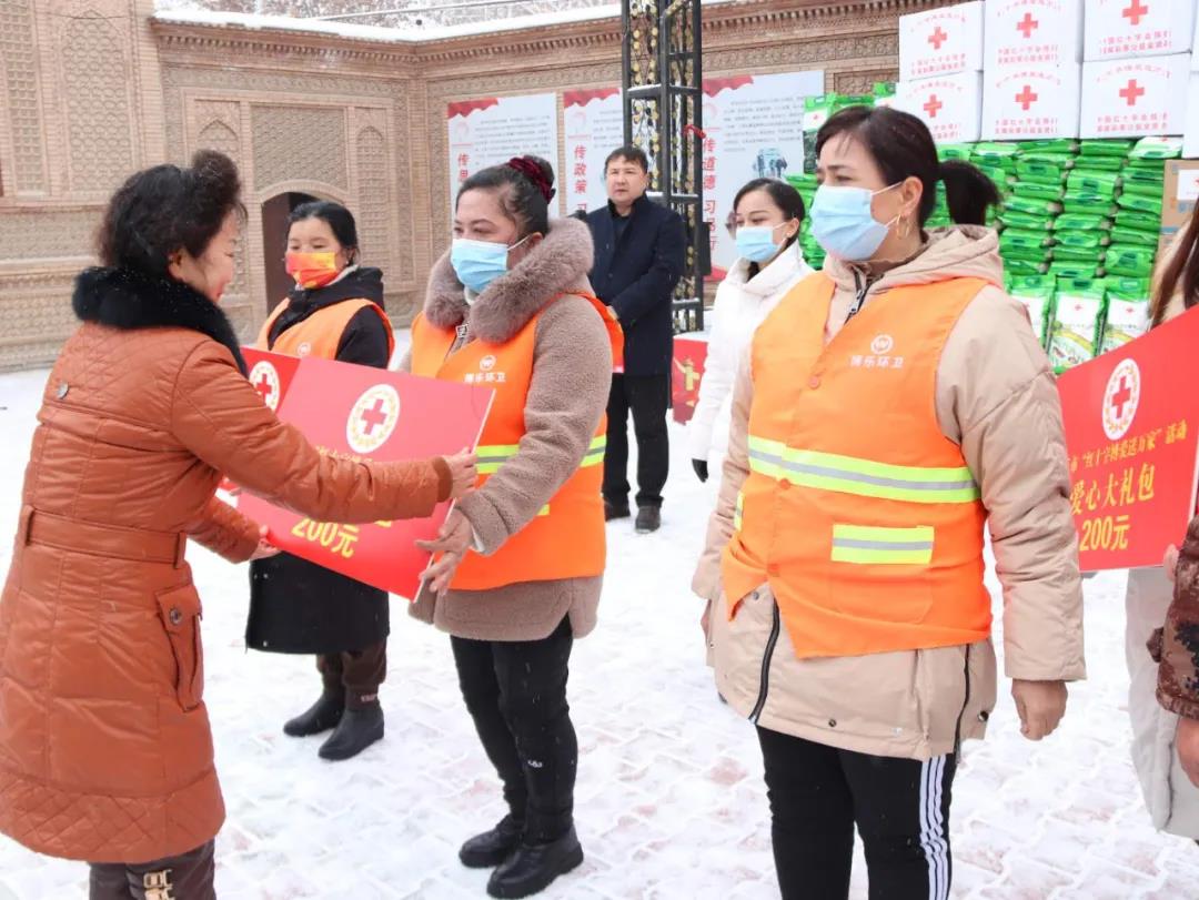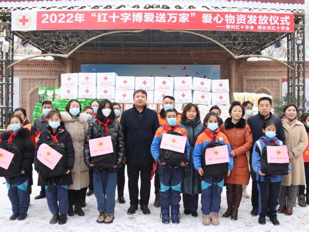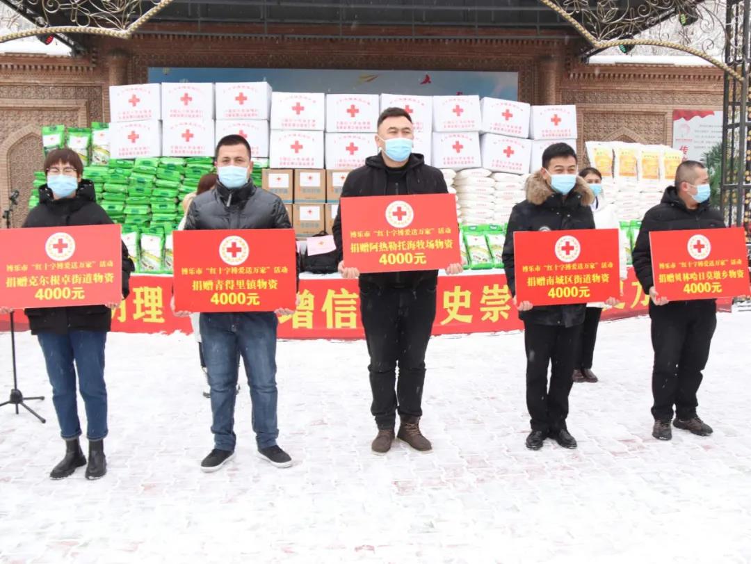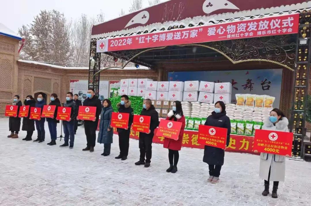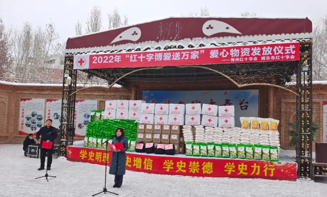 1月21日,博州红十字会与博乐市红十字会在博乐市克尔根卓街道西环社区举行了2022年度“红十字博爱送万家”爱心物资发放仪式。
