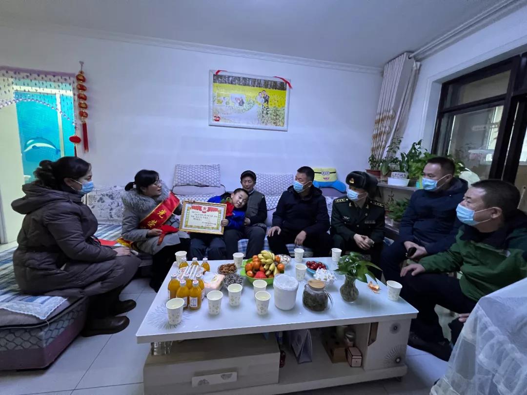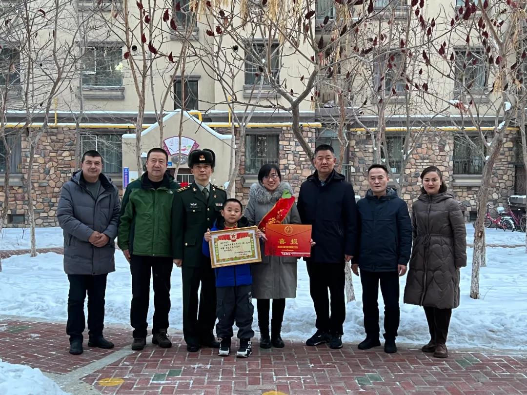 严冬送暖,岁寒情深。1月27日,博乐市党委常委、政法委书记刘小富,博乐市人民武装部部长代志生,博乐市退役军人事务局党组书记、副局长古丽拜克热木•阿布力米提,博乐市退役军人事务局党组成员、局长赵小刚及博乐市克尔根卓街道明珠社区相关负责人为荣立“二等功”现役军人杨金升家属送去喜报和慰问金以及新年美好的祝福。