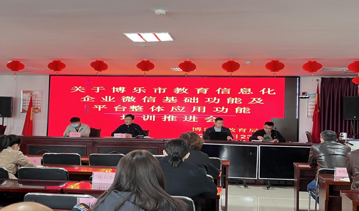 为切实推进博乐市教育系统智慧校园建设,加强学校安全管理,加快“博乐市教育局学校安全管理平台”建设,3月23日,在博乐市教育局召开博乐市教育信息化企业微信基础功能及平台整体应用功能培训推进会。博乐市教育局副局长虞京军、企业微信合作伙伴“杭州光海科技有限公司”负责人刘鑫海、博乐市各中小学、幼儿园相关负责人参加本次会议。