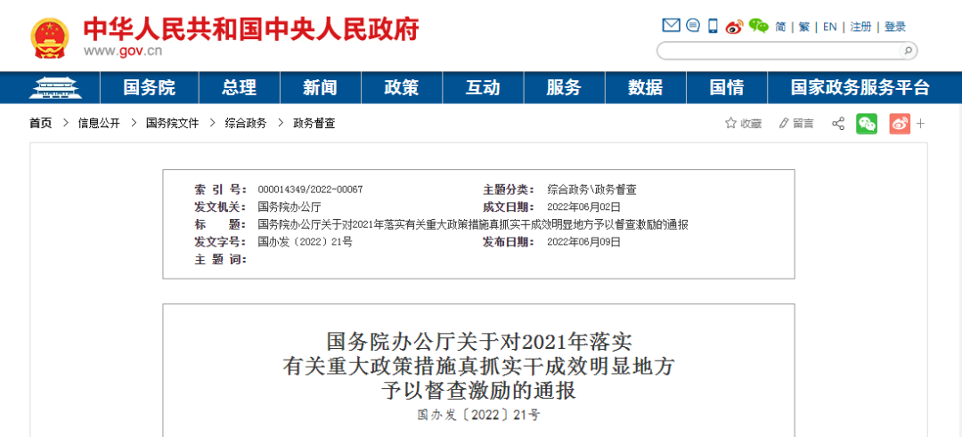 6月9日,据中国政府网消息,国务院办公厅发布通报,对2021年落实有关重大政策措施真抓实干成效明显地方予以督查激励。