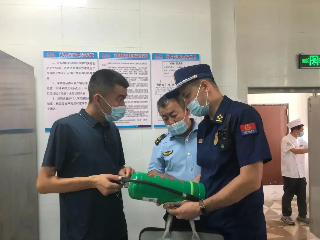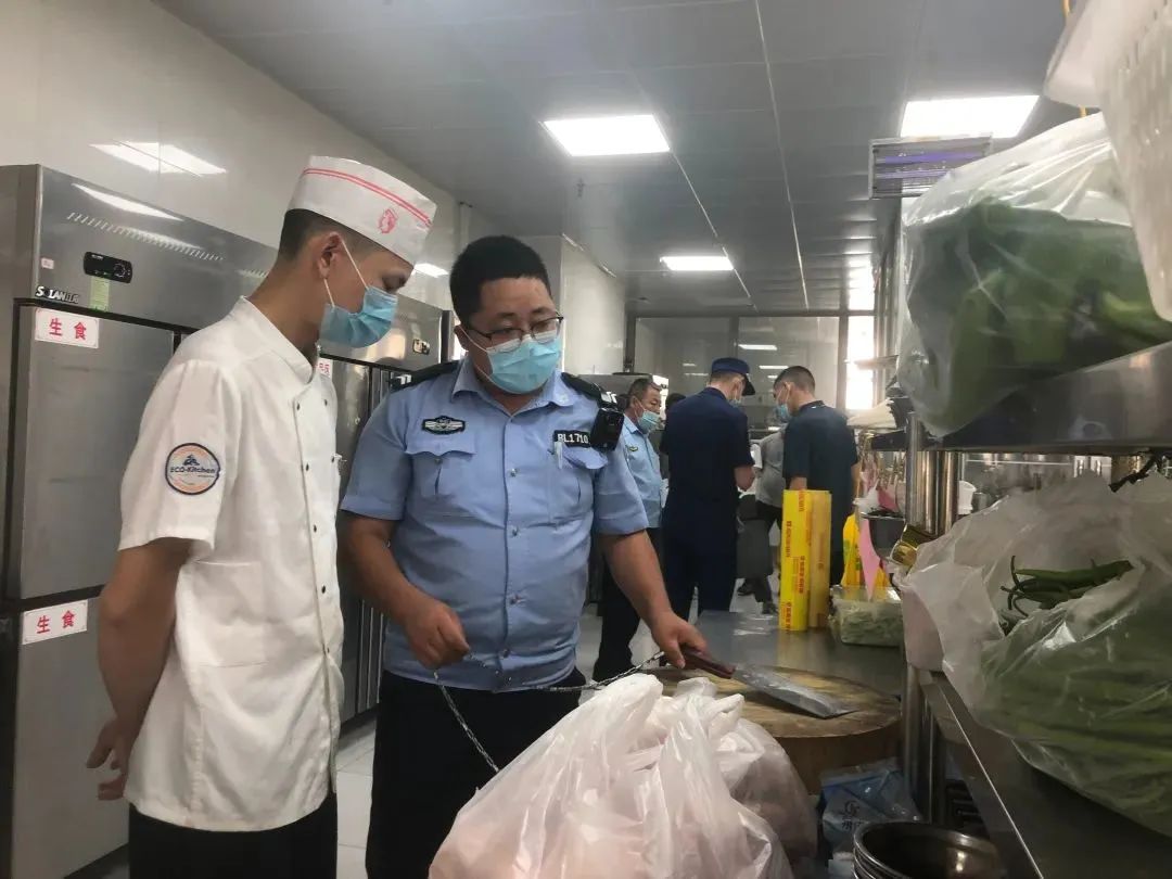 南城派出所民警对厨房用具进行安全检查,市场监督管理局则对从业人员健康证、证照经营范围、厨房卫生等方面进行检查,并要求从业人员做好对用餐人员佩戴口罩、扫码登记等疫情防控措施监管。