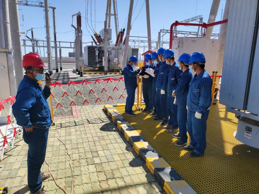 检修员工在220千伏博乐变电站处理1号主变压器中压侧 A、B相套管设备线夹发热缺陷前进行安全交底