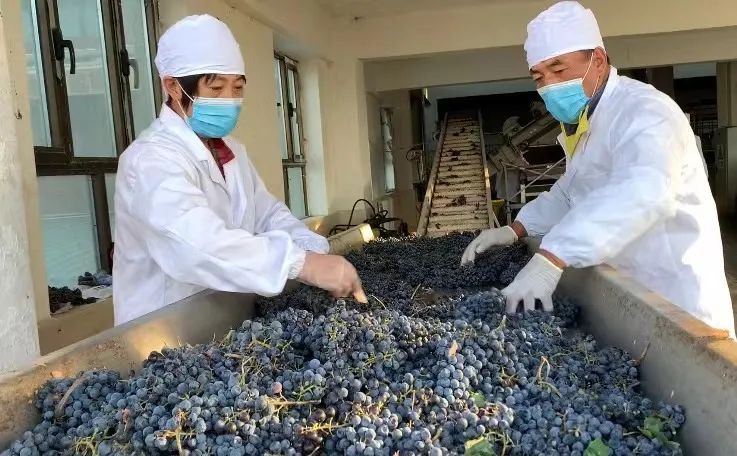 葡萄地里,工人们正手持剪刀、提着篮子,小心翼翼地采收葡萄,并将精心挑选成熟度高、品相好的葡萄装筐、称重、包装、装车直接运输到葡萄酒加工车间,经过两轮清洗,新鲜葡萄就被装进发酵罐中。