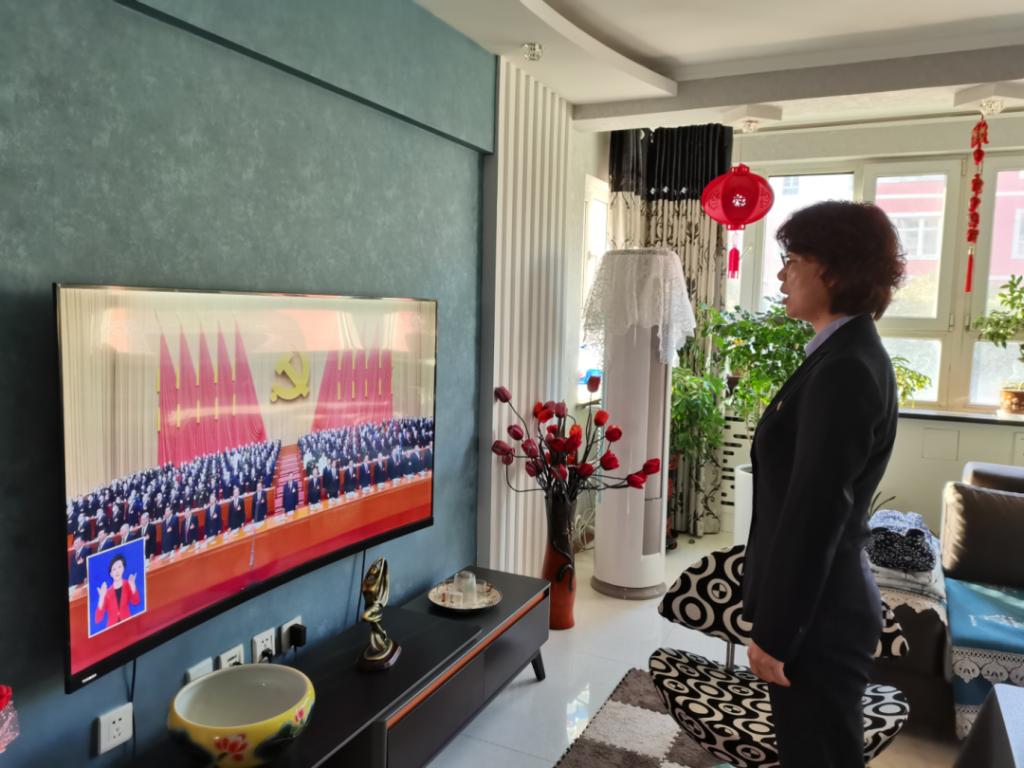 博州人大代表张晓玲观看党的二十大开幕会盛况,高唱国歌