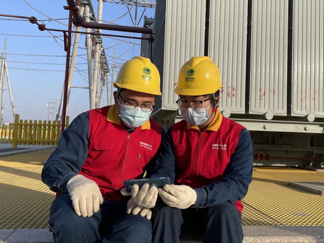 国网博尔塔拉供电公司运维人员任毅、芦琪在变电站保电现场收看党的二十大开幕会