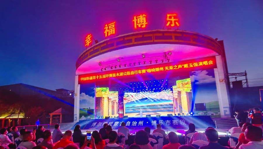 6月12日晚,博乐市西部文化广场华灯绽放、气氛热烈,中国新疆第十五届环赛里木湖公路自行车赛“唱响博州 天莱之声”戴玉强演唱会在这里举办。现场,灯光与音乐交辉,掌声与赞叹声相融,观众随着优美旋律享受文化盛宴。