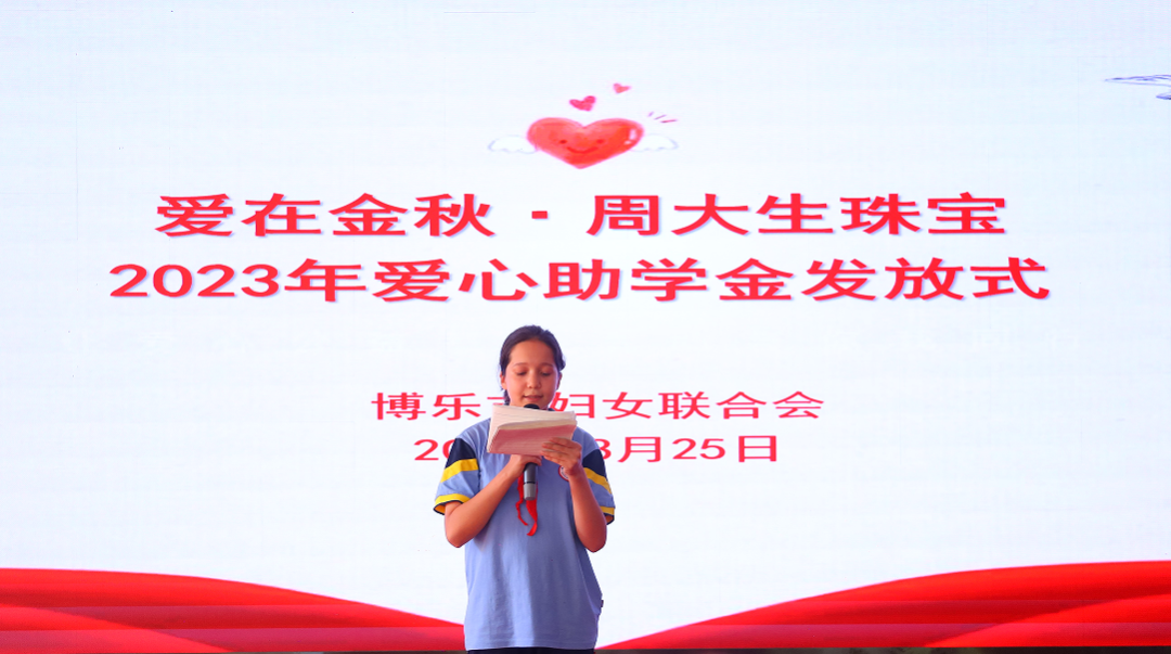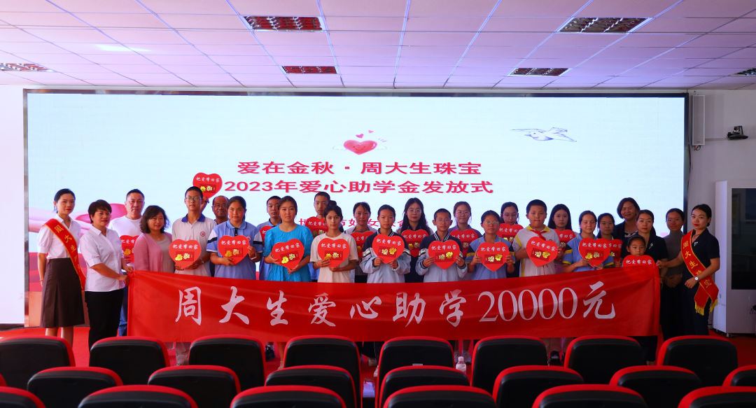 博乐市妇女联合会在博乐市第九中学组织了“爱在金秋 周大生珠宝2023年爱心助学金发放仪式”。
