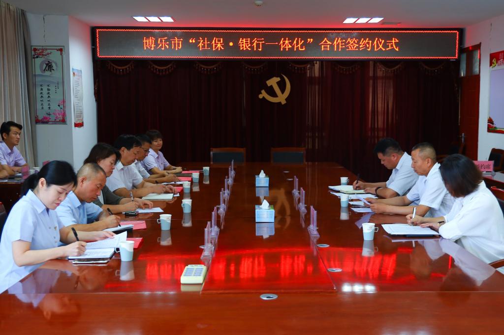 8月31日上午,博乐市社会保险中心与中国银行、建设银行以及博乐市农商银行等五家银行正式签订博乐市社银一体化服务网点建设项目合作协议,持续深化“放管服”,满足群众、企业“就近办”“多点可办”需求,合理利用银行资源,补充社保经办力量,积极开展线上线下合作办理(或委托办理)社保业务。