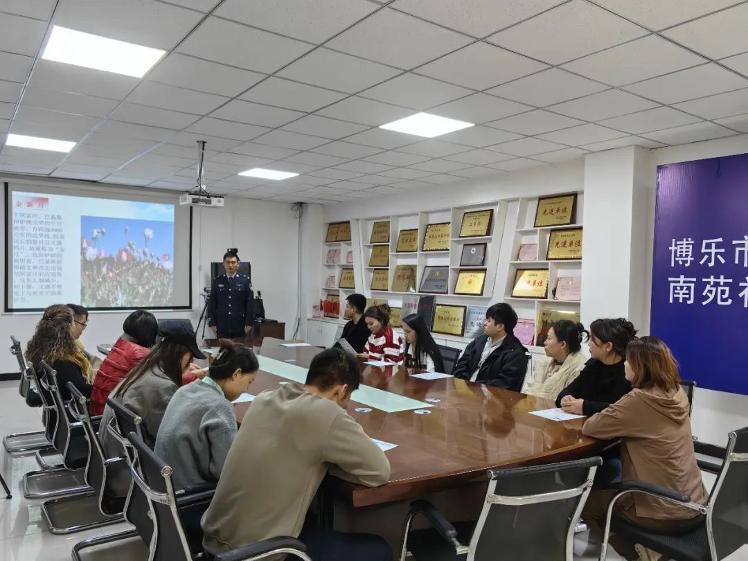 11月7日,博乐市南城区街道南苑社区组织社区民警、社区工作人员,在辖区开展禁毒知识宣传,进一步净化辖区环境,普及禁毒知识,提高居民对防毒、禁毒、拒毒的认识。