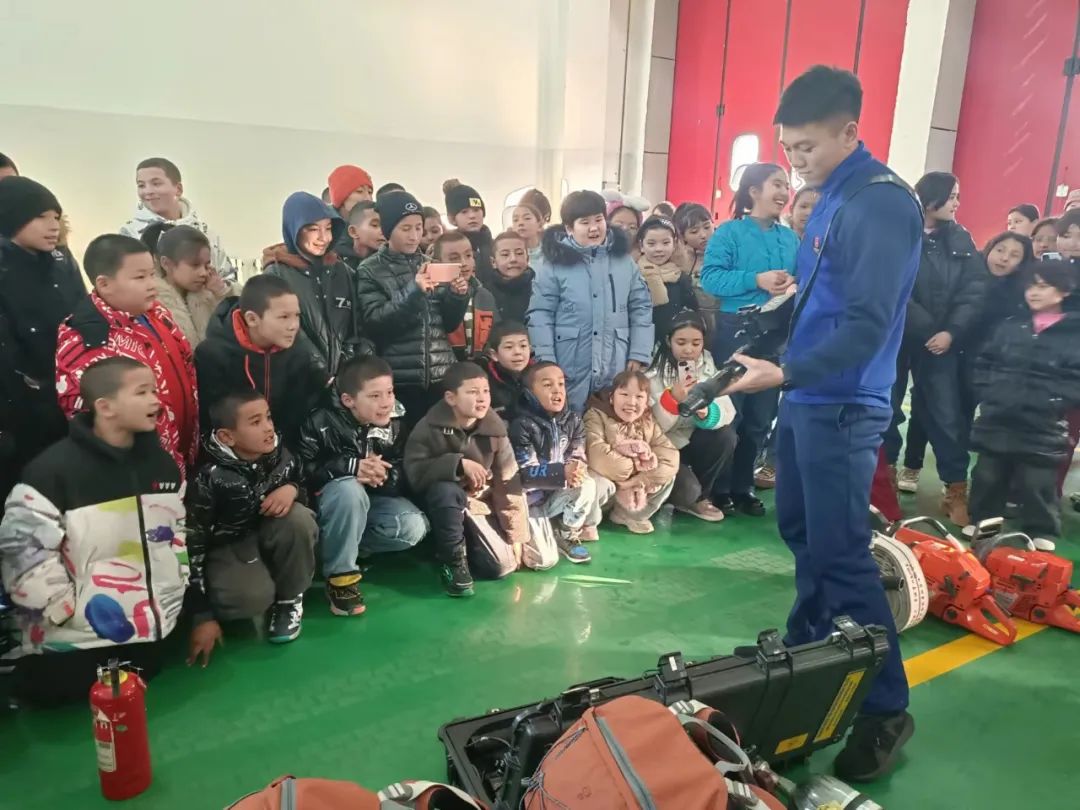 同学们在消防员的陪伴下,观摩了消防救援器材,了解了灭火器的使用方法,还特别体验了模拟火灾现场的安全逃生环节。