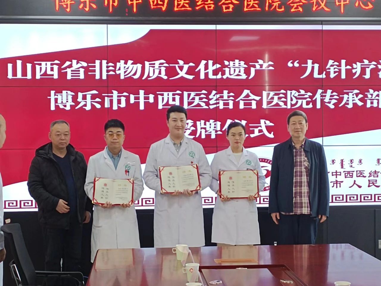 当日下午,王文德教授、蒋军清主任为博乐市中西医结合医院(博乐市人民医院)授发“九针疗法新疆博州传承部”牌匾,并继续开展为期三天的坐诊和培训。
