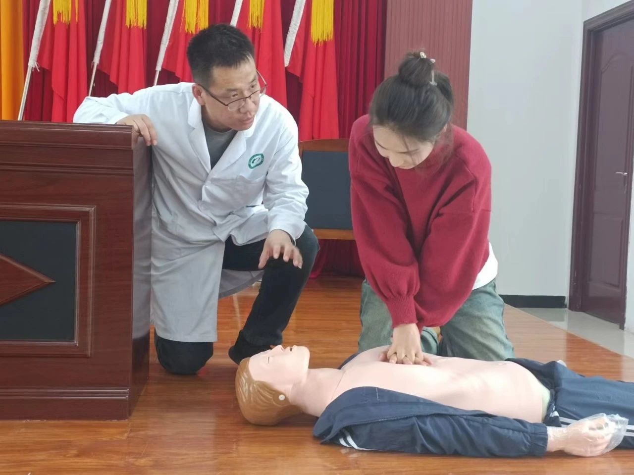 培训现场,红十字应急救护师为学员们讲授了心肺复苏、AED使用方法、气道异物梗阻、创伤救护四大技术等理论知识,并结合现场实操的方式,向大家演示了心肺复苏术、海姆立克急救法、体外自动除颤仪(AED)使用等常见急救技能,受训学员认真学习,仔细聆听每一个动作要领。在心肺复苏等实操环节,学员们踊跃参与互动,主动上前“沉浸式”体验,在老师的指导点评下,快速掌握了急救知识和实操要领,现场学习气氛热烈。
