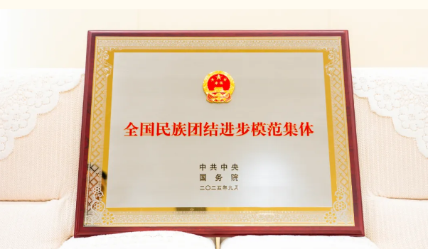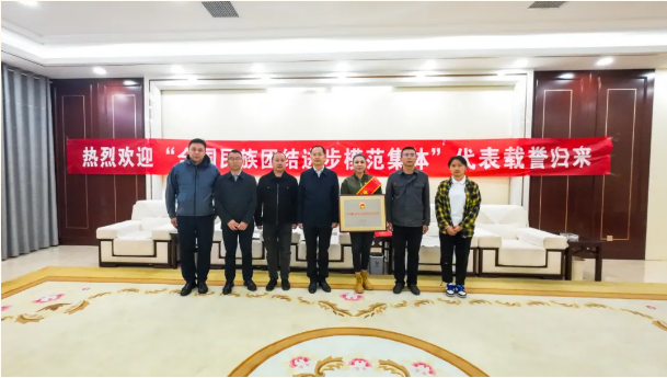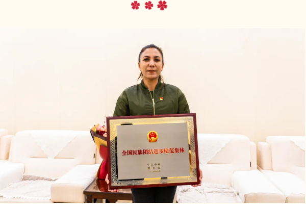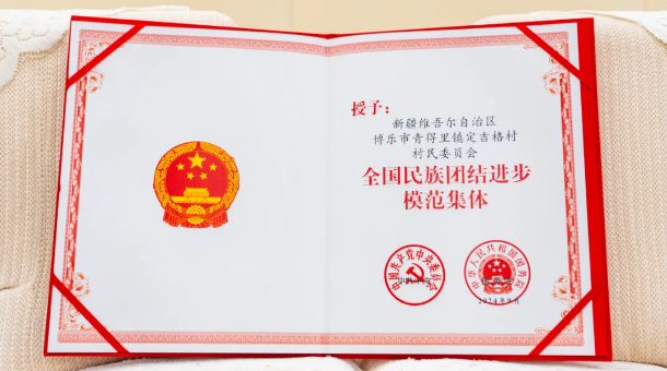 在全国民族团结进步表彰大会上,博乐市青得里镇定吉格村被授予“全国民族团结进步模范集体”荣誉称号。党总支书记西尔娜依代表全村群众上台领奖。