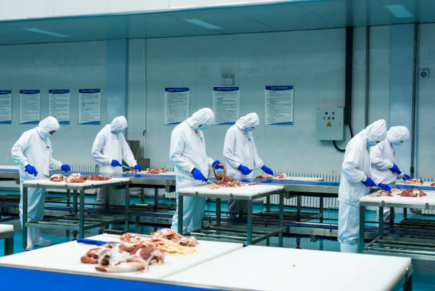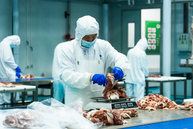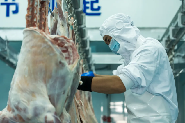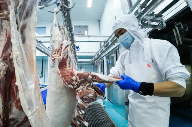 透过偌大明净的整块玻璃,宽敞整洁的分割车间一目了然,羊肉分割生产线上,穿着规范统一工作服的技术工人各司其职,熟练地将屠宰后的羊剔骨、分割、整形、修形,流程干净利落。