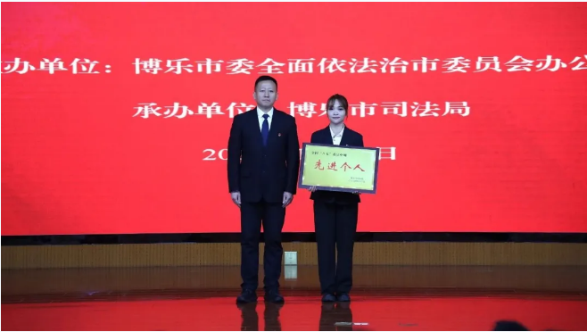 启动仪式上,全场与会嘉宾进行宪法宣誓,并为全国“八五”普法中期先进个人获得者青达拉街道书香社区党总支书记、居委会主任范恒晴现场授牌。