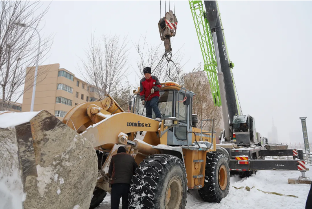 12月16日,在博乐市青得里河、星火干渠施工现场,远处吊车伸展长臂,近处挖掘机挥舞长臂,现场机械轰鸣,施工车辆川流不息,工人们正在进行河道清理、石料运输等作业。