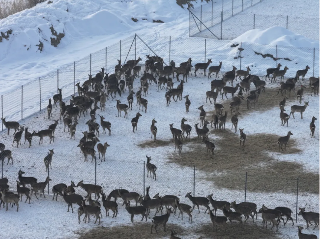 记者在现场看到,鹿舍与活动区域十分宽敞,梅花鹿能够自由奔跑嬉戏。院子里青草繁茂,圈舍中的自由采食罐内储备着充足的营养饲料。尽管当日室外气温逼近零下20摄氏度,但自动饮水槽始终保持常温。
