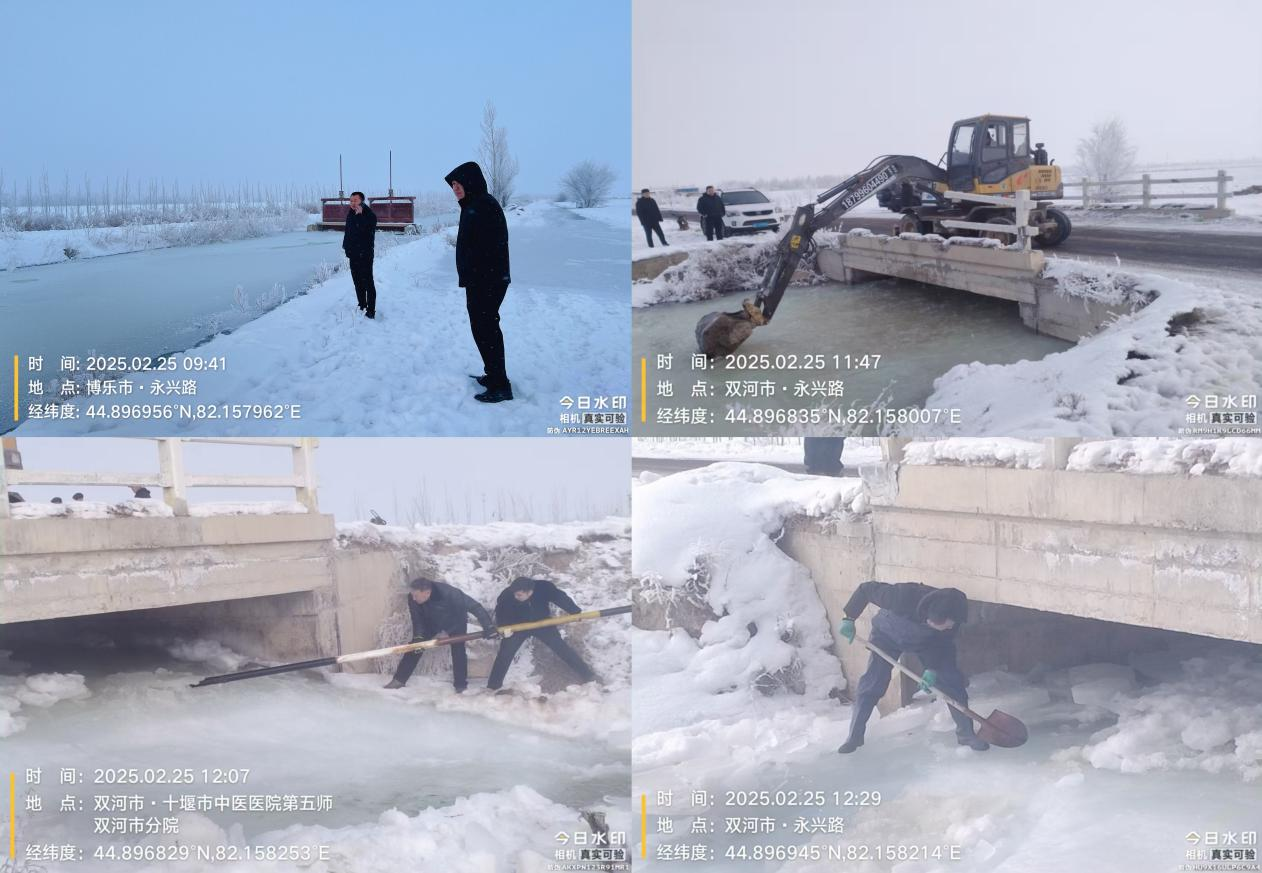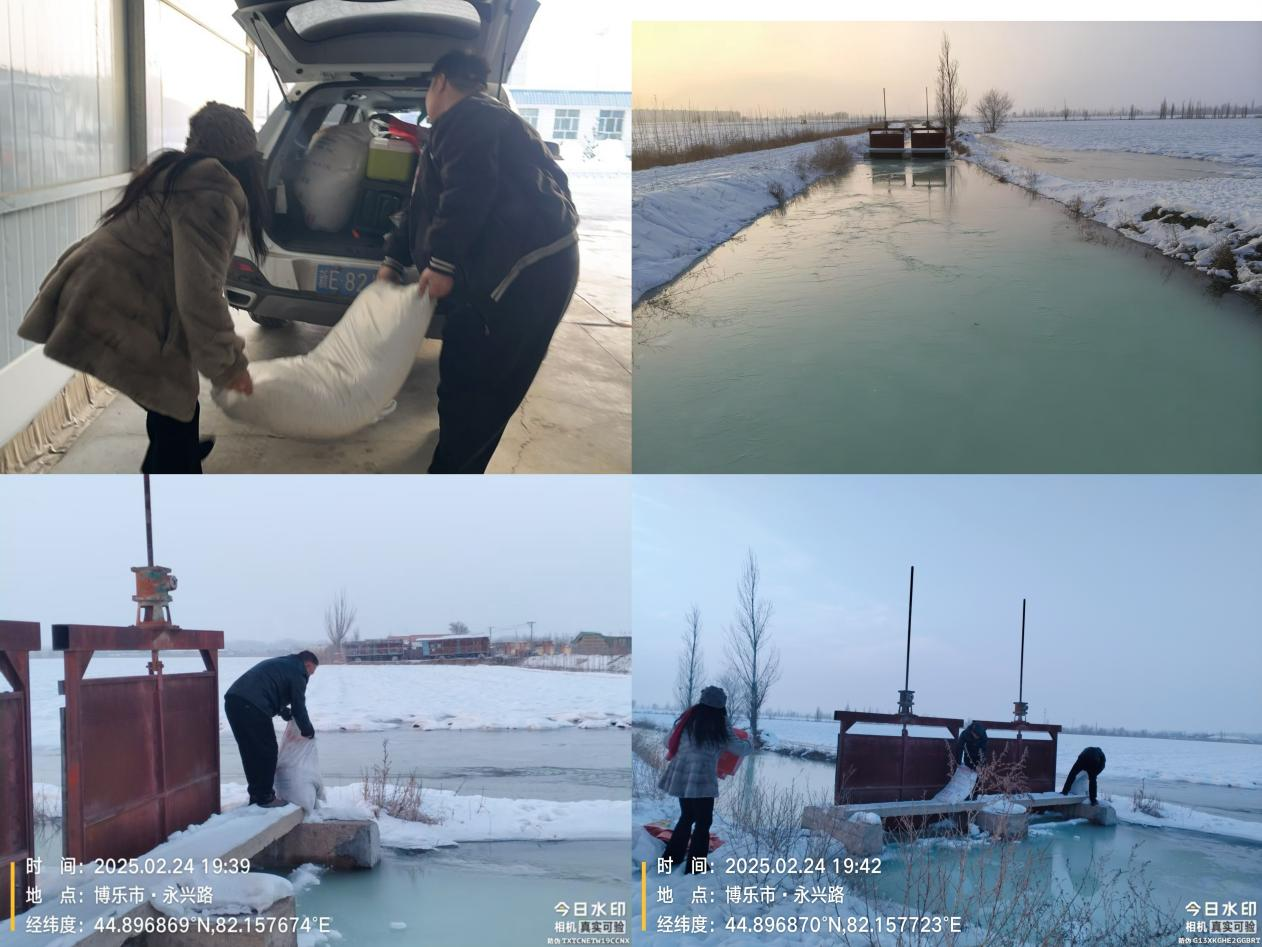工作中,张飞书记组织所有干部职工带头打头阵,利用机械、人力等方式进入冰冷刺骨的河水中,他们身穿防水雨裤、手拿冰铲、铁锨等工具,在冰面上洒融雪剂,加快冰的融化速度。作业期间,工作人员不怕苦,不怕累,鼓足干劲,轮流上阵,连续奋战,破除闸室及闸口前后冰层,疏通桥洞堵塞冰块,确保输水畅通,圆满完成了本次抗击冰洪工作任务,切实保障了全镇的河道安全。