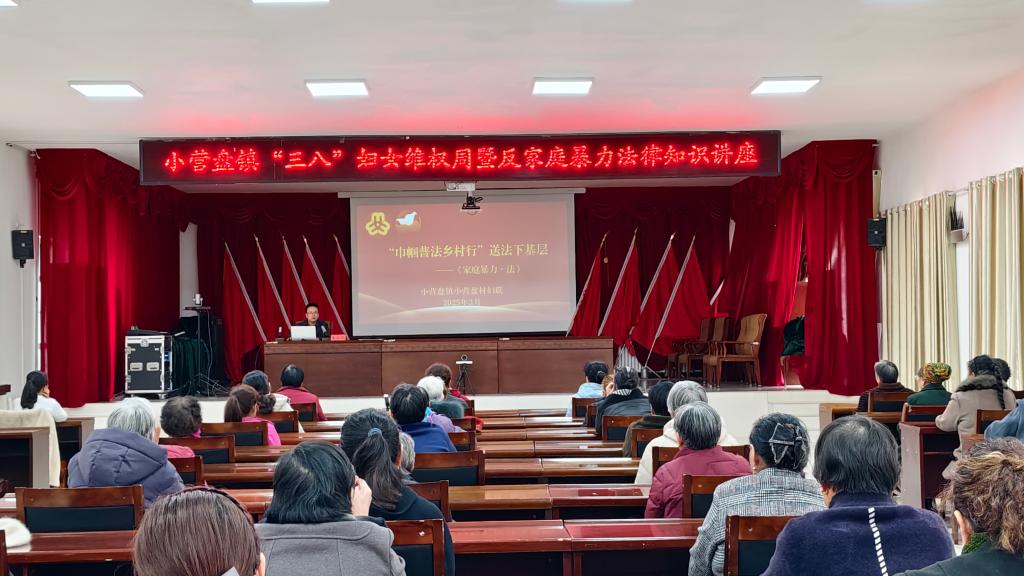 为提高全民反家庭暴力意识,预防和制止家庭暴力,营造全社会共同维护妇女儿童合法权益的浓厚氛围。小营盘镇妇联紧紧围绕“三八维权周,送法下基层”的活动主题,于3月18日下午开展“三八”妇女维权周暨反家暴普法知识讲座。此次活动参与人员由村社区妇联主席、执委、妇女群众组成,共90余人参加了讲座。