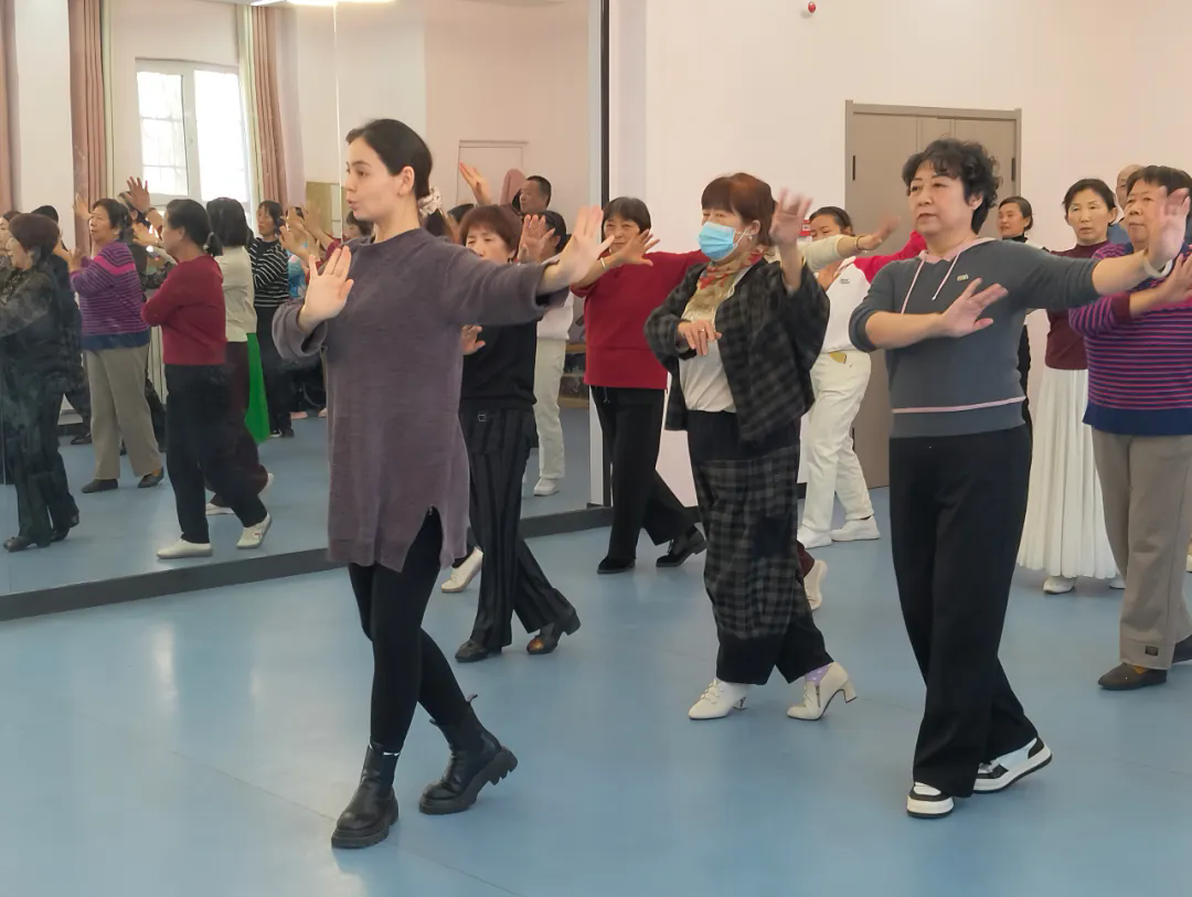 在舞蹈 “翻腕” 动作教学环节,老师亲身示范,手臂抬起,手腕放松,手指自然舒展,以手腕为轴快速流畅地翻转,动作轻盈柔美。居民们紧跟节奏,努力模仿。起初,部分居民力度和速度把握欠佳,动作略显僵硬,但随着反复练习,逐渐找到感觉,动作愈发流畅,脸上洋溢着收获的喜悦。