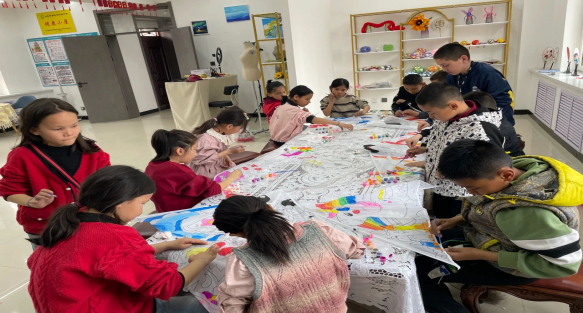 活动最后,社区干部通过团辅活动“手拉手,心连心,共创团结情”进一步强化了孩子们的团队意识和合作能力。在集体按手印环节中,孩子们各展风采,挑选自己喜欢的染料,在画布上尽情描绘,在纸上印上自己的手印。重重叠叠的手印,不仅展现了孩子们“奉献、友爱、互助、进步”的志愿精神,也象征着社区大家庭的团结与和谐。