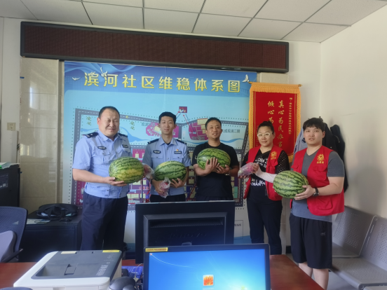 随后,志愿者们先后来到小区物业服务中心和社区警务室。面对顶着烈日维护社区秩序、处理日常事务的社区民警,志愿者们将清凉水果递到他们手中,对其长期以来守护辖区安全稳定的辛勤付出致以衷心感谢。