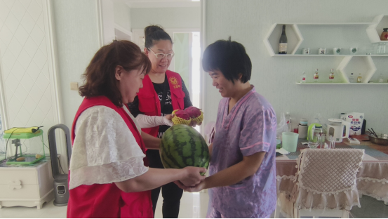 走访慰问过程中,党员志愿者们分组行动。在孤寡老人家中,志愿者们仔细查看防暑措施,贴心叮嘱高温天气的注意事项;走进困难党员家中,大家围坐交谈,感谢他们为社区发展作出的贡献。当志愿者来到聋哑居民贺姐姐家时,通过手机打字耐心交流,详细询问生活需求。贺姐姐接过水果时,眼中闪烁着感动的泪花,双手迅速比划出“谢谢”的手语,脸上绽放出灿烂的笑容,无声的感谢传递着满满的温暖与信任。