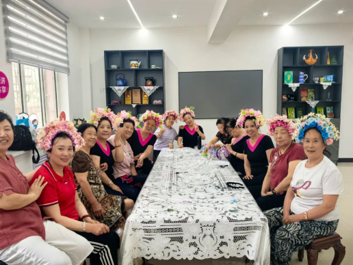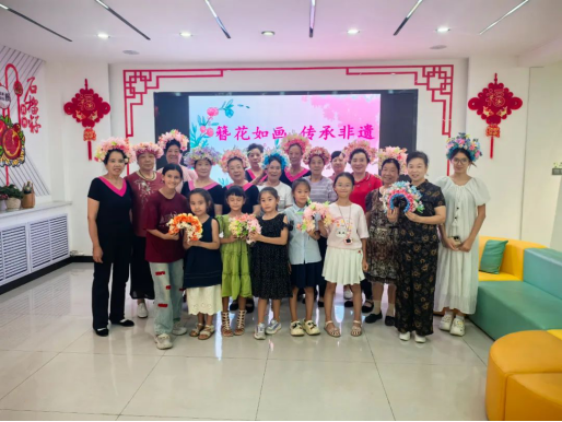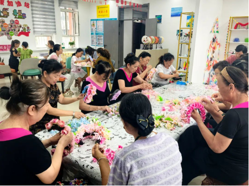 在实践环节,街道为阿姨和青少年们准备了丰富的非遗材料包,包含仿真绢花、绒条、珍珠、金属发簪及泡沫发箍等工具,既保留了传统工艺精髓,又降低了制作门槛。两位来自高校的大学生志愿者侯珊珊和乌日娜同学化身“非遗导师”,手把手指导居民如何以铁丝塑形、用热熔胶固定花朵,并传授色彩搭配与造型设计技巧。居民们全神贯注,指尖翻飞间,粉嫩的牡丹、清雅的兰花、热烈的玫瑰渐次成型。团结之花舞蹈队的何婵娟阿姨兴奋地展示着她的作品:“以前只在戏曲里见过簪花,今天亲手做才知其中门道!这朵牡丹要层层叠叠才显富贵,配色还得和衣裳相衬,真是处处皆学问!”活动尾声,居民们戴上亲手制作的簪花,在街道文化墙前合影留念,发间摇曳的花朵与脸上的笑容相映成趣,构成一幅流动的民俗画卷。