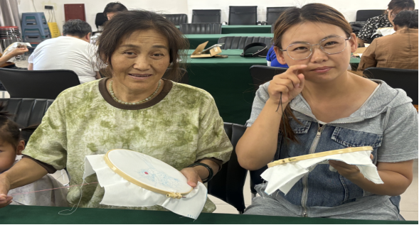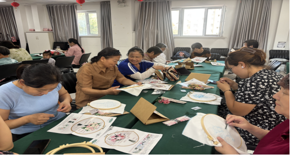实践环节中,居民们围坐在一起,从简单的轮廓勾勒到基础针法练习,大家耐心尝试。有的居民手指不够灵活,反复练习打结技巧;有的小朋友在家长陪伴下,认真模仿平针绣法。现场欢声笑语不断,针线在布面上灵动游走,渐渐勾勒出花朵、蝴蝶等图案雏形。