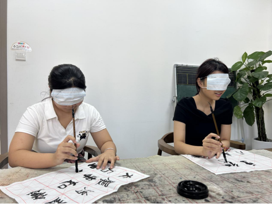 理论讲解结束后,活动进入了最受期待的趣味“盲写”环节。在这个环节中,大家被要求蒙上眼睛,仅凭刚才学到的笔法感觉和对字形结构的记忆,在纸上书写指定的简单汉字或自己的名字。这一新颖的形式瞬间点燃了全场的气氛。大家既紧张又兴奋,小心翼翼地落笔。摘下眼罩后,看到自己笔下那些“出乎意料”“歪歪扭扭”的字迹时,现场爆发出阵阵欢快的笑声。这个环节并非追求书写的完美,而是为了打破对“写错、写丑”的恐惧,让大家纯粹地体验毛笔与纸张接触的触感,感受线条的流动与力量,从而更加深刻地理解书法中“心手合一”的意境,极大地增强了活动的趣味性和参与感。